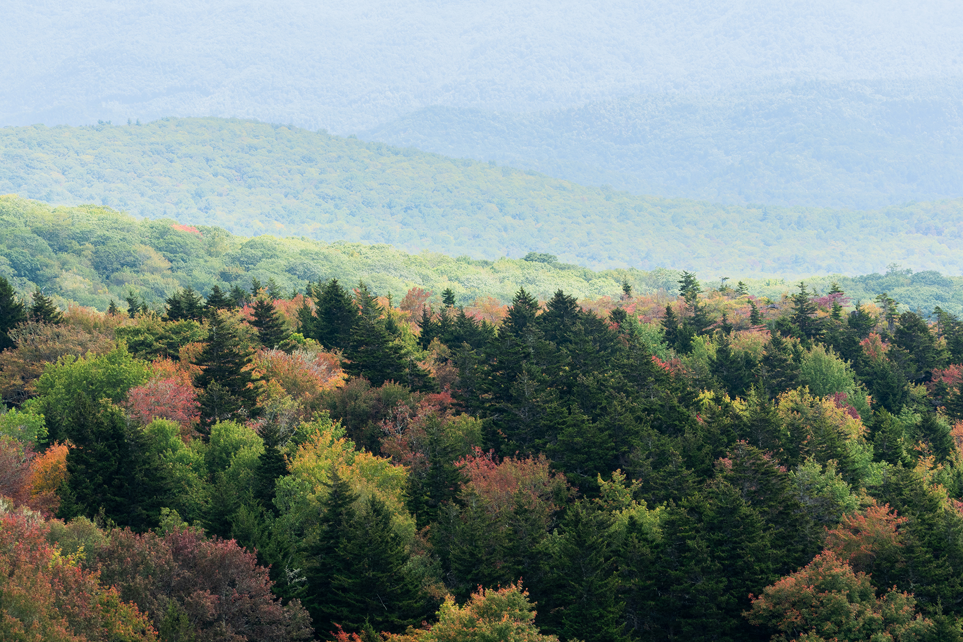 Standing at Scheer Bluff on Grandfather Mountain and looking out towards the Blue Ridge Parkway is one of the first areas to see the leaves changing color each year.
